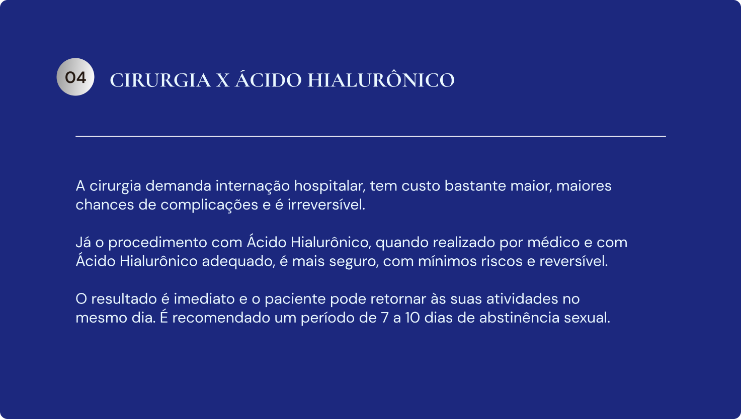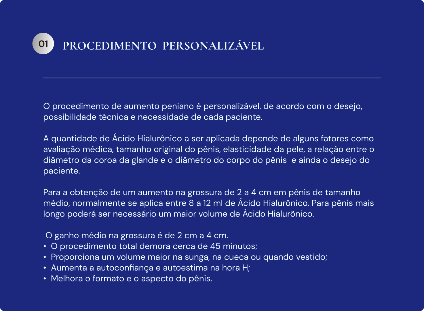 O Ácido Hialurônico é uma substância naturalmente presente no corpo humano. O resultado é natural, não altera a ereção nem a sensibilidade, e apresenta baixíssimo risco quando aplicado por um médico especialista em anatomia peniana e procedimentos estéticos.