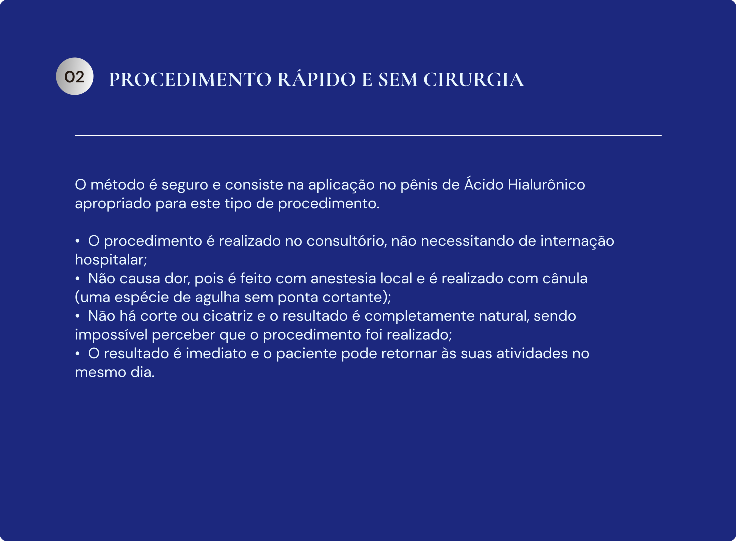 Durante o procedimento, aplicamos anestesia local para que você não sinta dor. Em seguida, o ácido hialurônico — uma substância segura e biocompatível — é injetado de forma precisa ao redor do corpo peniano, aumentando a circunferência de maneira uniforme. Não há cortes, internação ou afastamento prolongado das atividades.