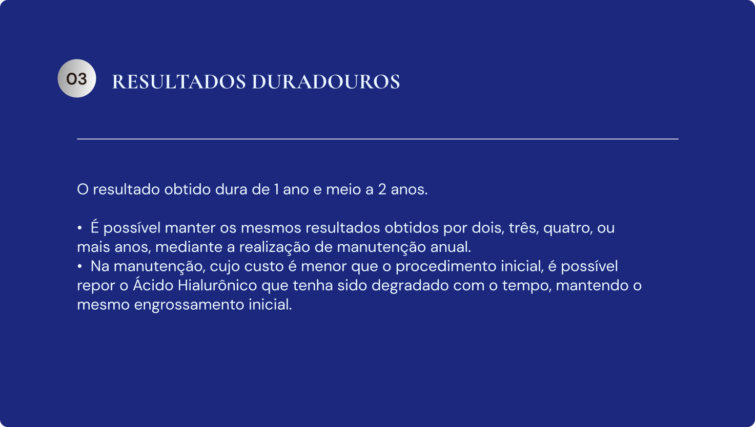 O resultado costuma durar de 18 à 36 meses. Se, por qualquer motivo, você não se adaptar ao novo volume, é possível reverter o procedimento com uma enzima que dissolve o produto, devolvendo o aspecto original.